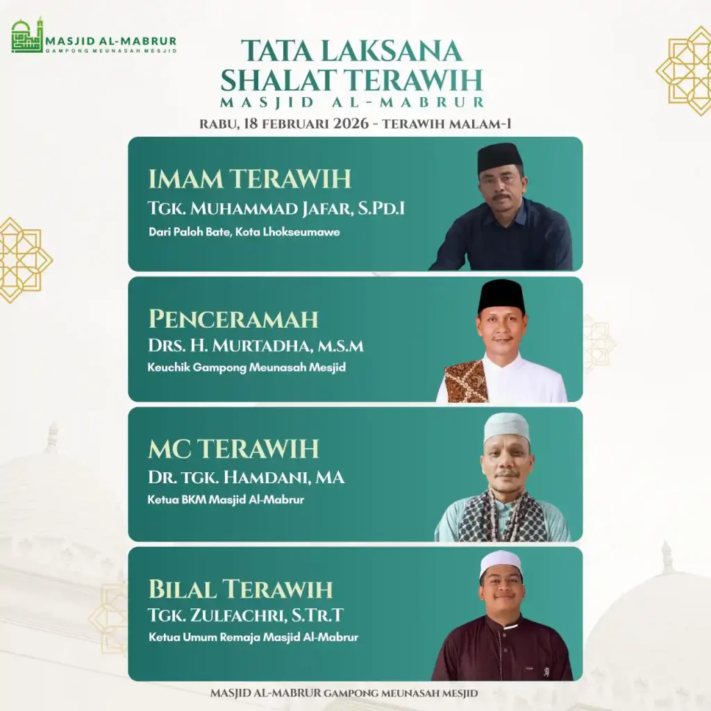 Adapun yang bertindak sebagai MC Tarawih adalah Dr. Tgk. Hamdani, MA, selaku Ketua BKM Masjid Al-Mabrur, dan Bilal Shalawat akan dipandu oleh Tgk. Zulfachri, S.Tr.T, Ketua Umum Remaja Masjid Al-Mabrur.