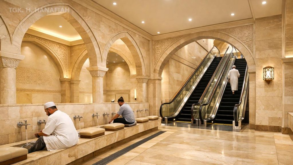 Secara visual, desain masjid menonjolkan karakter arsitektur Timur Tengah yang megah, dengan elemen kubah dan struktur bangunan yang elegan serta detail ornamen yang memperkuat identitas Islami. Sentuhan futuristik terlihat dari tata ruang yang lebih terbuka, pencahayaan modern, serta pendekatan desain yang adaptif terhadap perkembangan zaman.